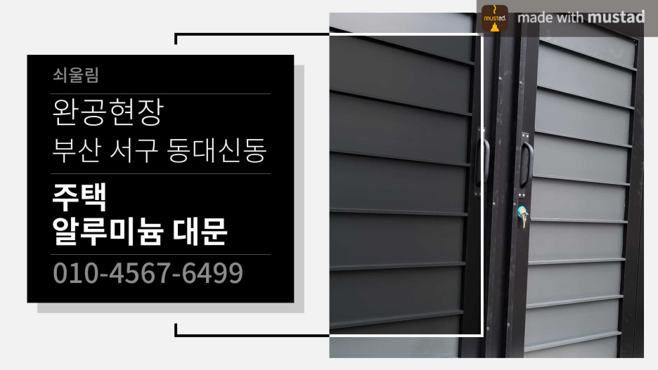 | [부산 대문] 부산 연제구 거제동 - 주택 알루미늄 대문 제작, 시공, 설치 (0) | 2022.08.31 |